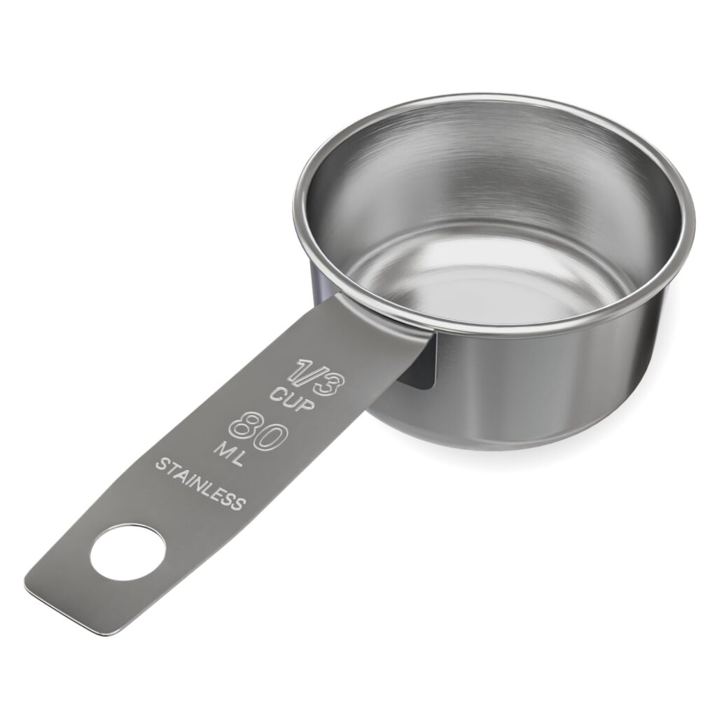 If you only need one dependable measuring cup size, the Knupp Co. 1/3 Cup Stainless Steel Measuring Cup is a simple, durable pick. Made from extra-thick stainless steel, it’s built for everyday scooping and measuring—whether you’re leveling flour, packing brown sugar, or tackling sticky ingredients like peanut butter.
