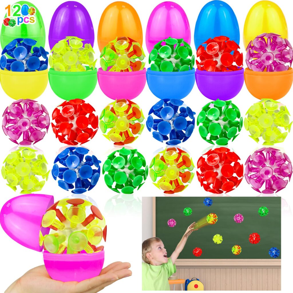 - 12 pre-filled plastic Easter eggs (2.8 x 2.2 in) in 6 colors, each with a 2.3-inch suction cup ball toy inside