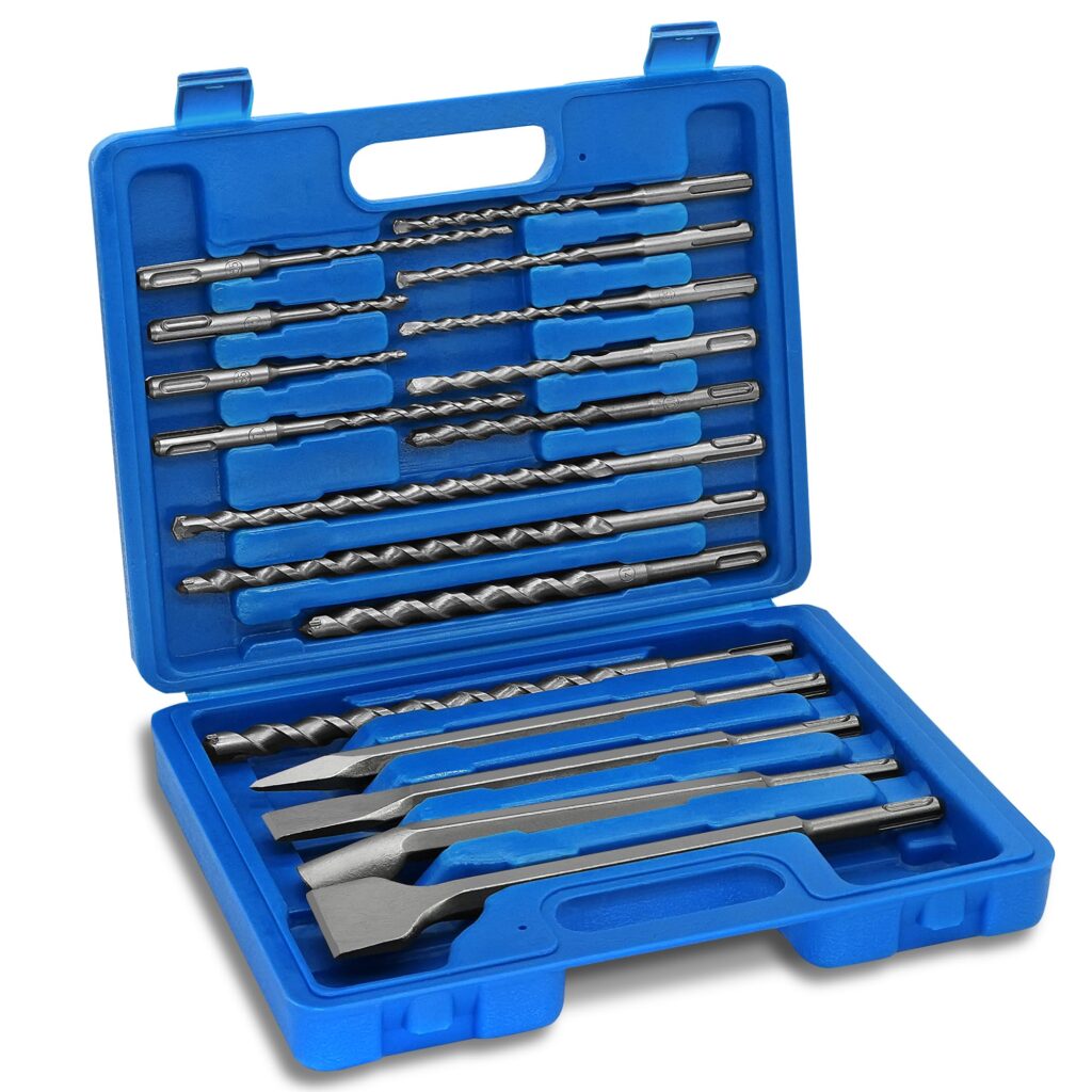 - 17-piece set: 13 SDS-Plus drill bits plus 4 chisels (point, two flat, and U-groove)