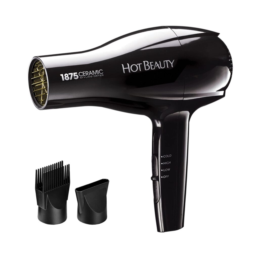 The Hot Beauty 1875 Ceramic Styler is a lightweight, compact blow dryer designed for fast, controlled styling whether you’re getting ready at home or packing for a trip. It uses advanced ionic technology to help reduce static and support smoother-looking, shinier results while you dry.