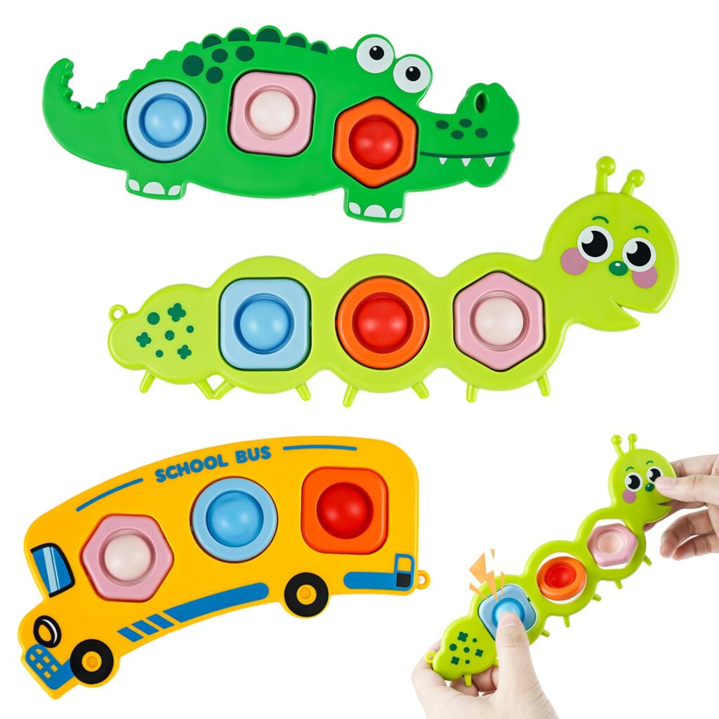If youâre looking for a small, easy-to-pack activity for flights, road trips, restaurants, or waiting rooms, this QETRABONE 3-piece fidget popper set is built for grab-and-go play. It includes three fun designsâcaterpillar, crocodile, and school busâeach with poppable bubbles that you can press for satisfying pops and then flip to keep the play going.
