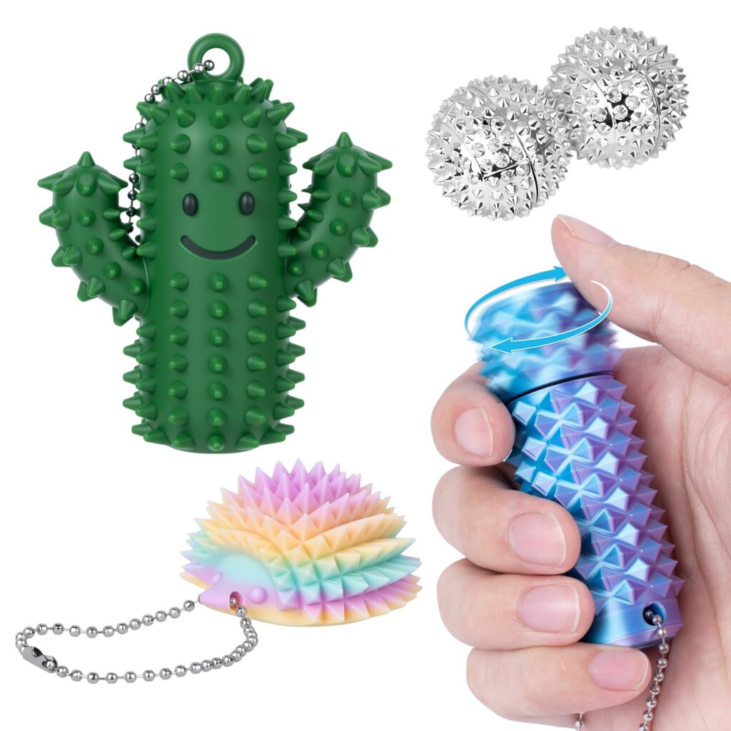 Inside the kit you’ll find a mix of tools for different types of stimming and grounding: a squeezable cactus for deep-pressure input, a rotating “little ouchies” piece for sharper tactile feedback, two spiky balls for rolling/squeezing, and a layered multicolor hedgehog for visual-tactile stimulation. The set includes keychains, making it easy to keep one nearby at a desk, in a bag, or while traveling.
