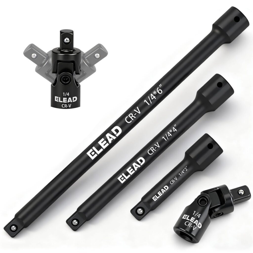 The ELEAD 4-Piece 1/4" Drive Socket Extension Bar Set is a practical add-on for any small-drive ratchet setup when bolts and screws sit just out of reach. You get three extension lengths (2", 4", and 6") plus a 1/4" drive universal joint socket—handy for working around obstacles and in tight angles during automotive repair and general mechanical maintenance.