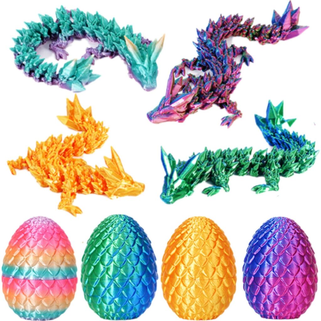 Bring a bit of fantasy to your shelf, desk, or gift basket with the YILCER 4PCS 3D Printed Dragon Eggs set. Each vibrant egg opens to reveal a mini dragon inside, turning a simple “mystery egg” into a fun collectible moment.