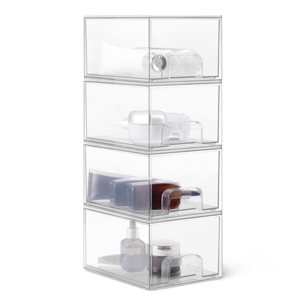 Declutter your vanity, bathroom counter, or dresser top with the Amazon Basics Stackable Plastic Storage Makeup Organizer Drawers. This 4-pack of clear drawers helps keep makeup and other small essentials contained, visible, and easy to grab—without digging through bags or bins.
