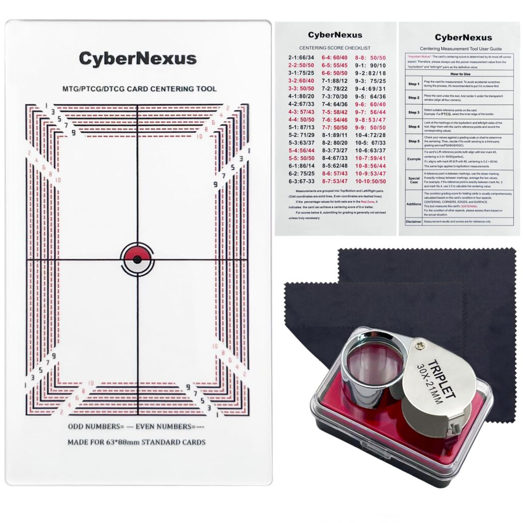 This set includes a 30X steel magnifying loupe for detailed viewing on the go, plus a cleaning cloth kit to keep your cards and the tool clear while you work. It also comes with step-by-step instructions and centering reference materials so even newer collectors can start evaluating cards with more confidence.