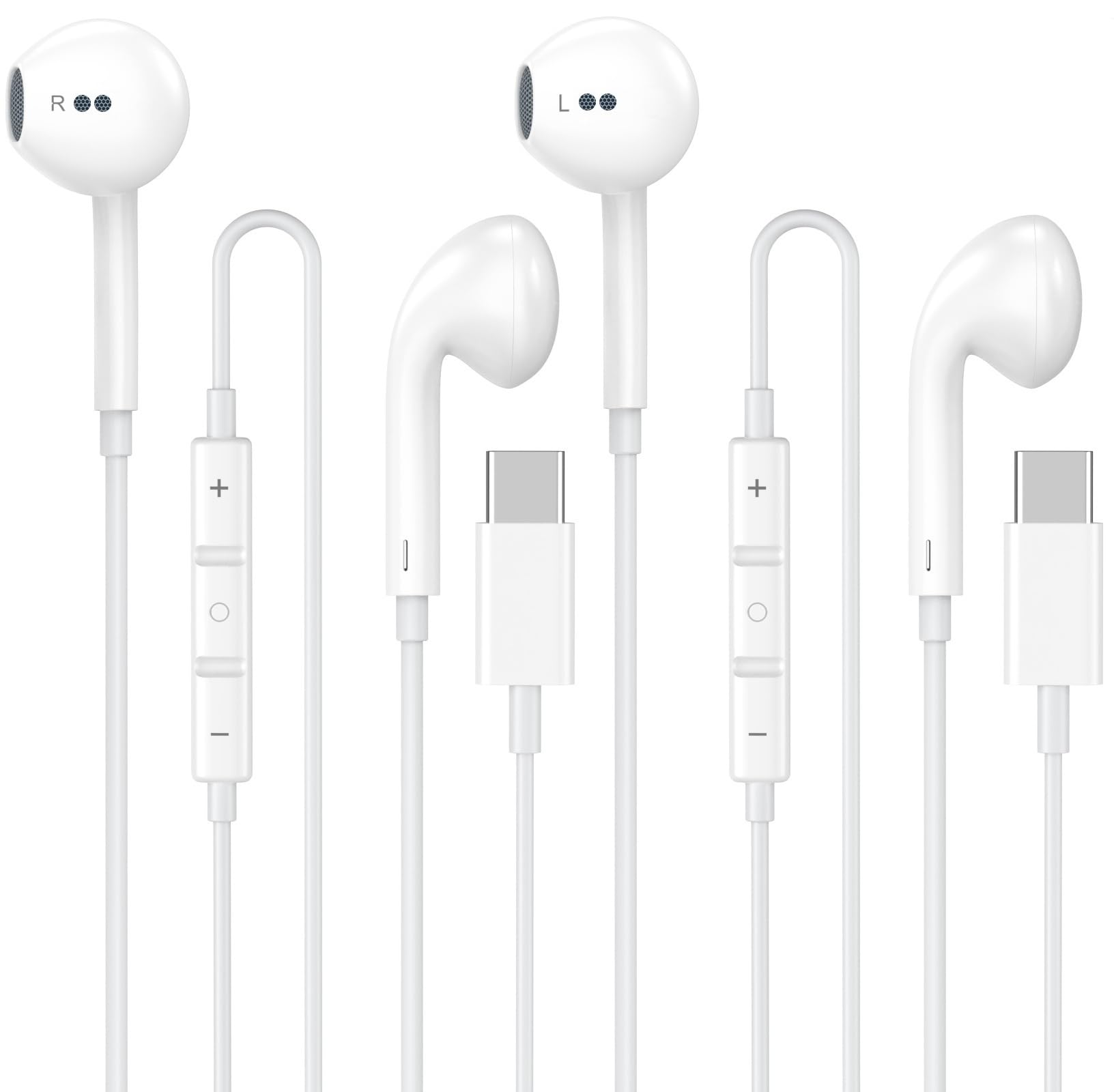 Affordable USB-C wired earbuds for USB-C iPhone, iPad, Samsung Galaxy, Google Pixel, and more—featuring a built-in DAC chip, in-line mic/remote, and a lightweight half-in-ear design.