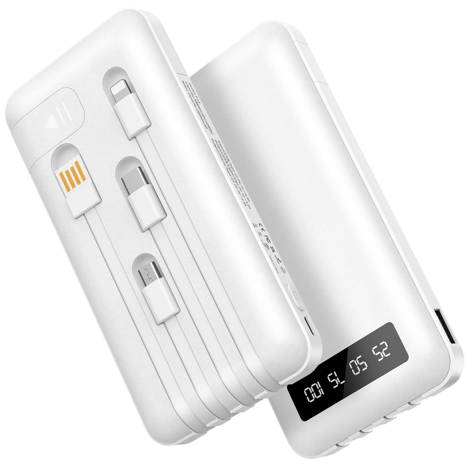 A high-capacity 20,000mAh Amazon Basics power bank with 3 outputs (1 USB-A, 2 USB-C), LED battery indicators, and an included 1 ft USB-C to USB-C charging-only cable—built for travel and everyday backup power.