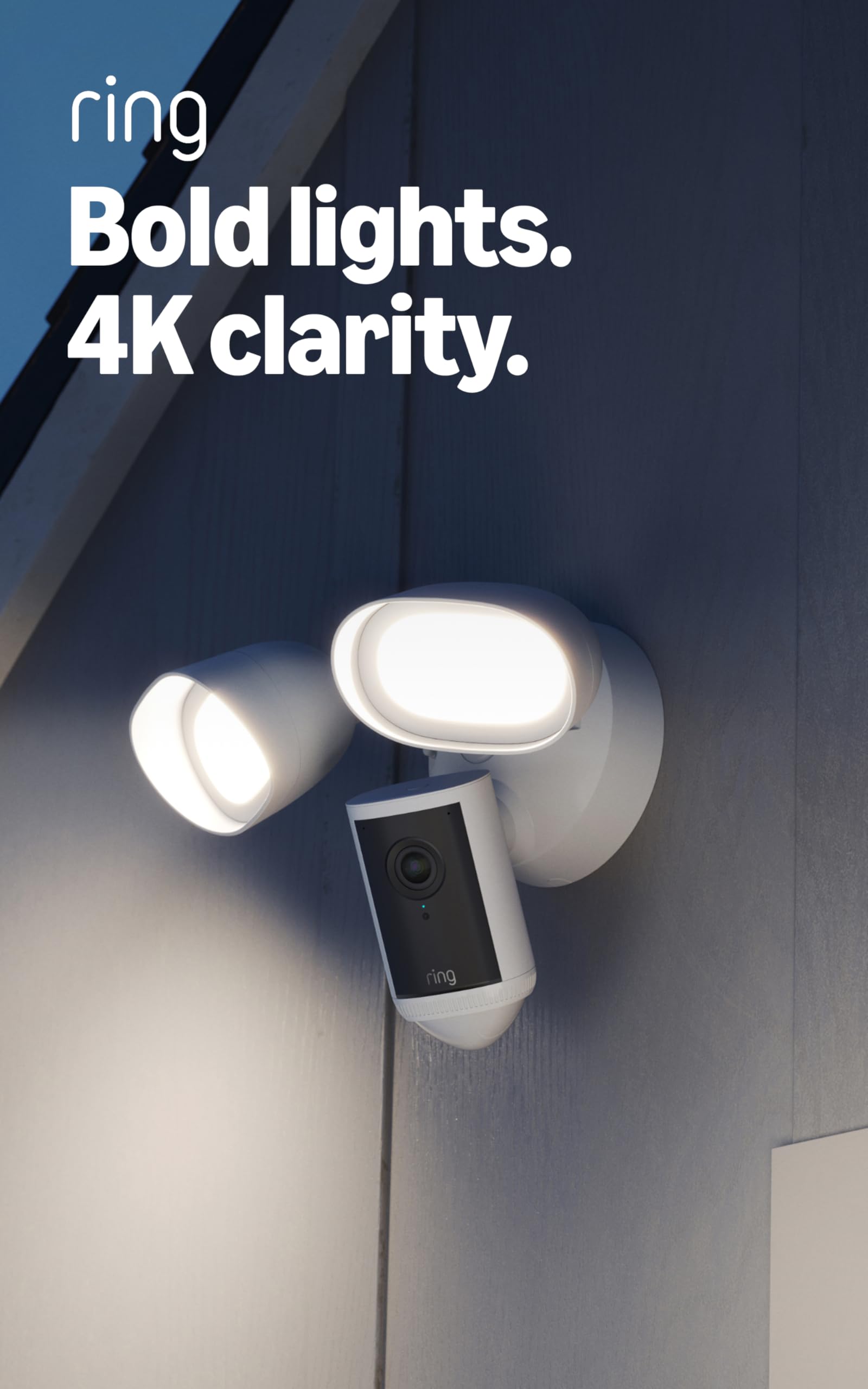 A wired Ring floodlight camera built for home or business security with Retinal 4K wide-angle video, 10x Enhanced Zoom, 3D Motion Detection for precise alerts, Low-Light Sight color viewing in near-dark, and 2000-lumen motion-activated floodlights—plus Two-Way Talk with Audio+ and a remote-activated siren in the Ring app.