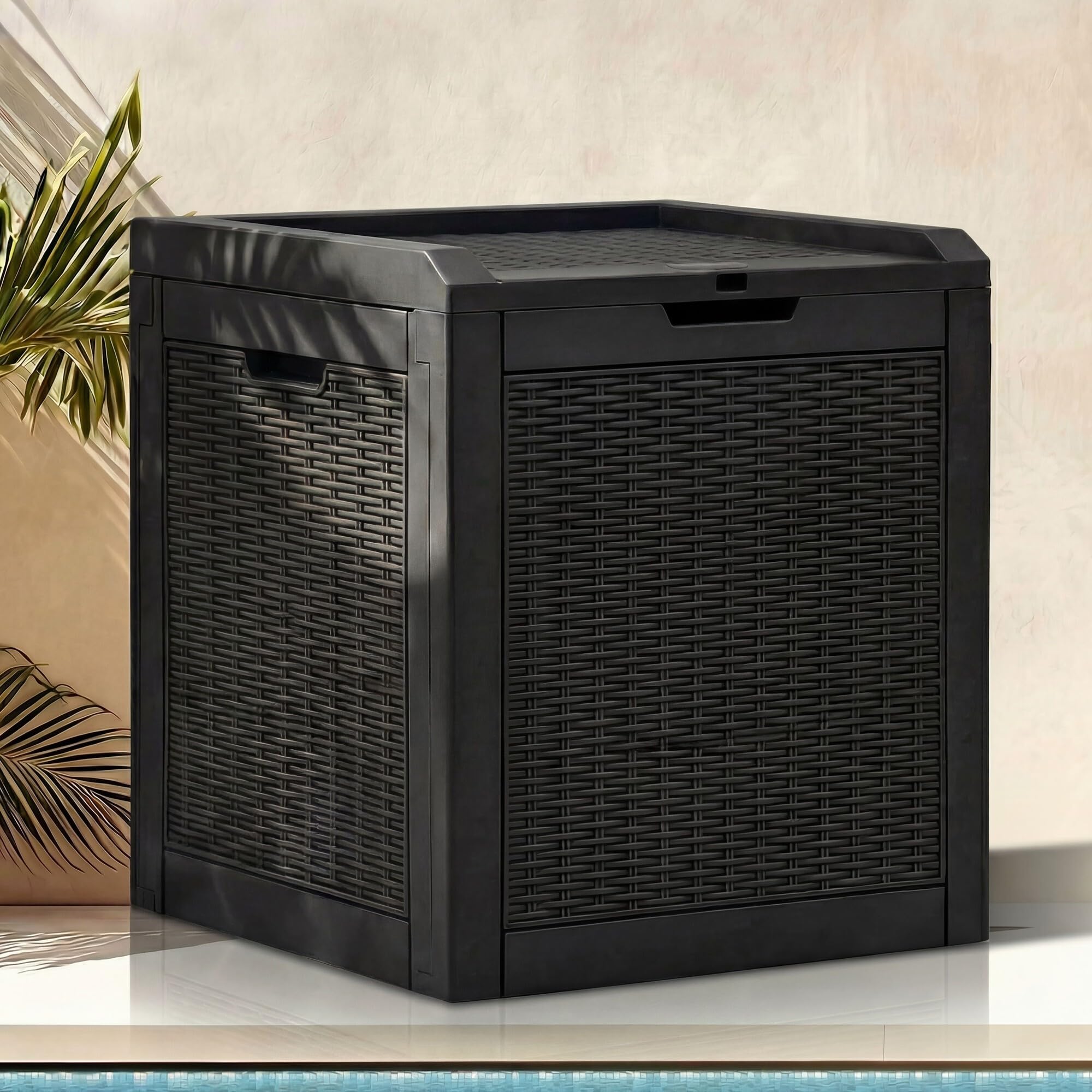 A compact, waterproof, lockable 33-gallon deck box designed for porch deliveries and everyday outdoor storage—finished in a modern white rattan/wood-grain look.