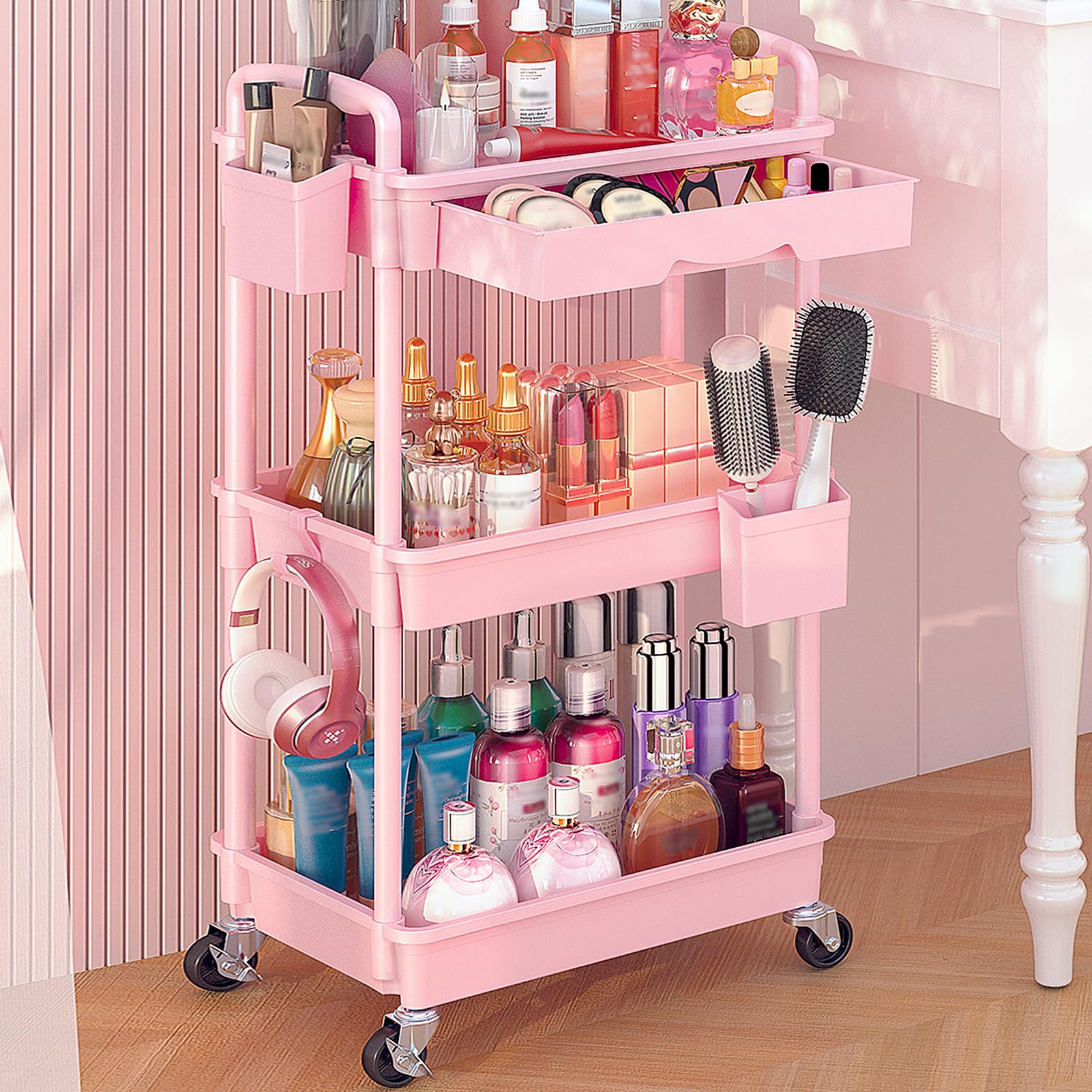 A lightweight, 3-tier pink rolling beauty cart with a removable dust-reducing drawer, lockable 360° wheels, and flexible hooks/cups—built to keep vanity, bathroom, or nail supplies organized and easy to move.