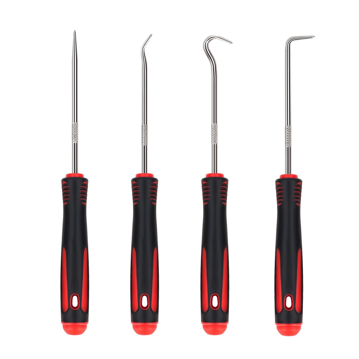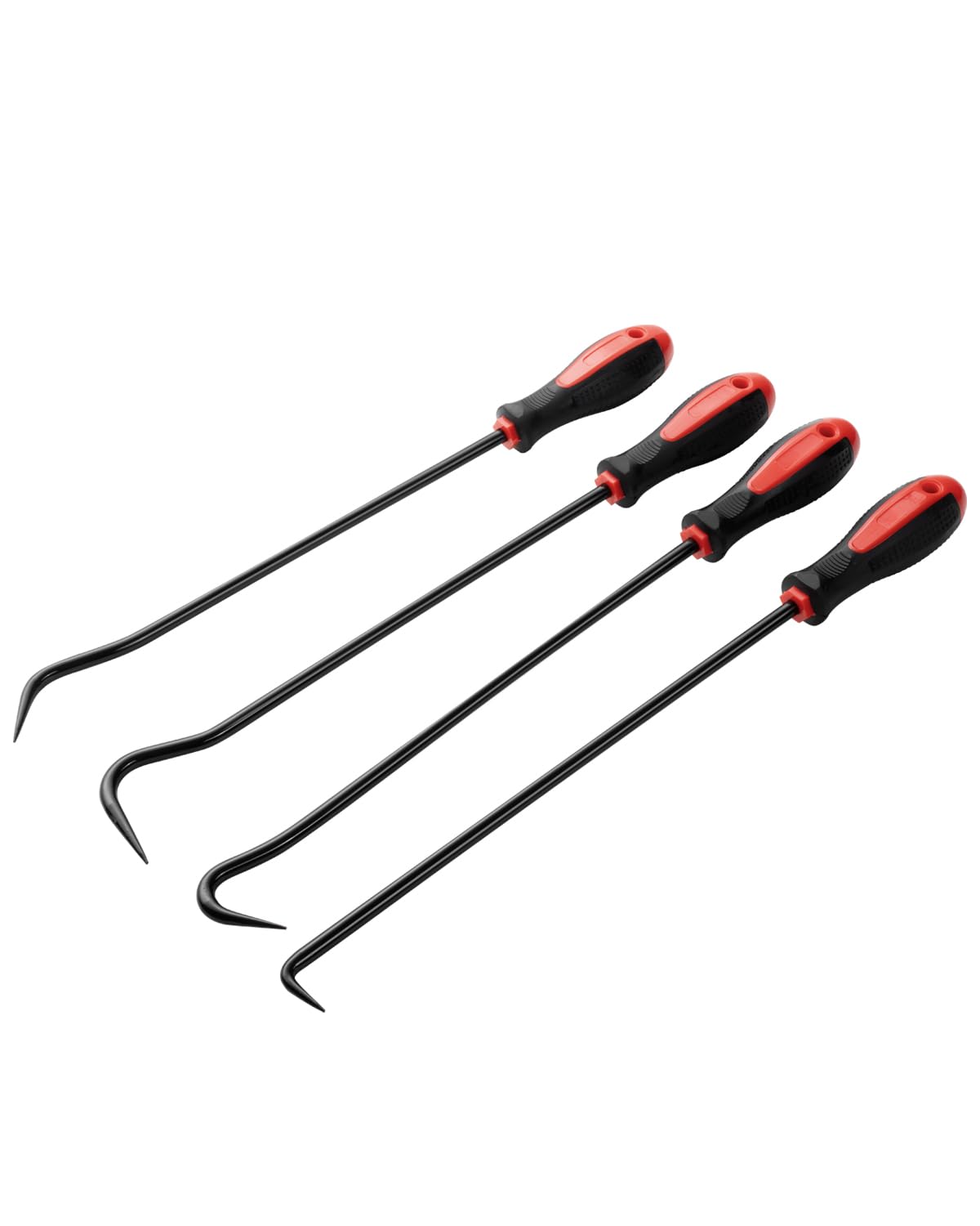 A heavy-duty, extra-long 4-piece hook and pick set designed to reach tight spots for hose removal and detail work—built with heat-treated CR-V steel shafts and ergonomic, non-slip grips.