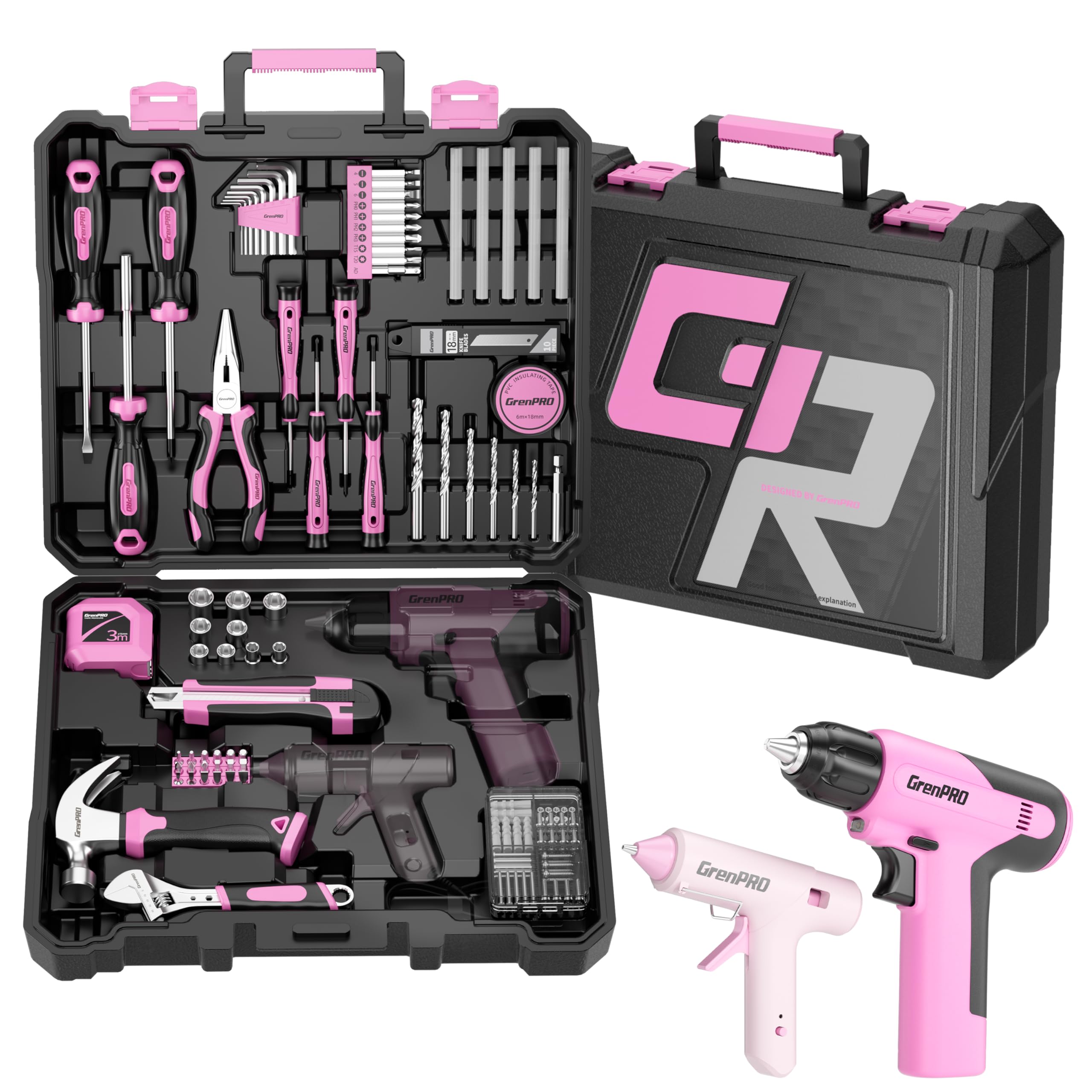 A complete 188-piece pink tool kit from GRENPRO featuring a compact cordless drill, essential hand tools, and a portable storage case—ideal for home projects, furniture assembly, and basic household or car tasks.