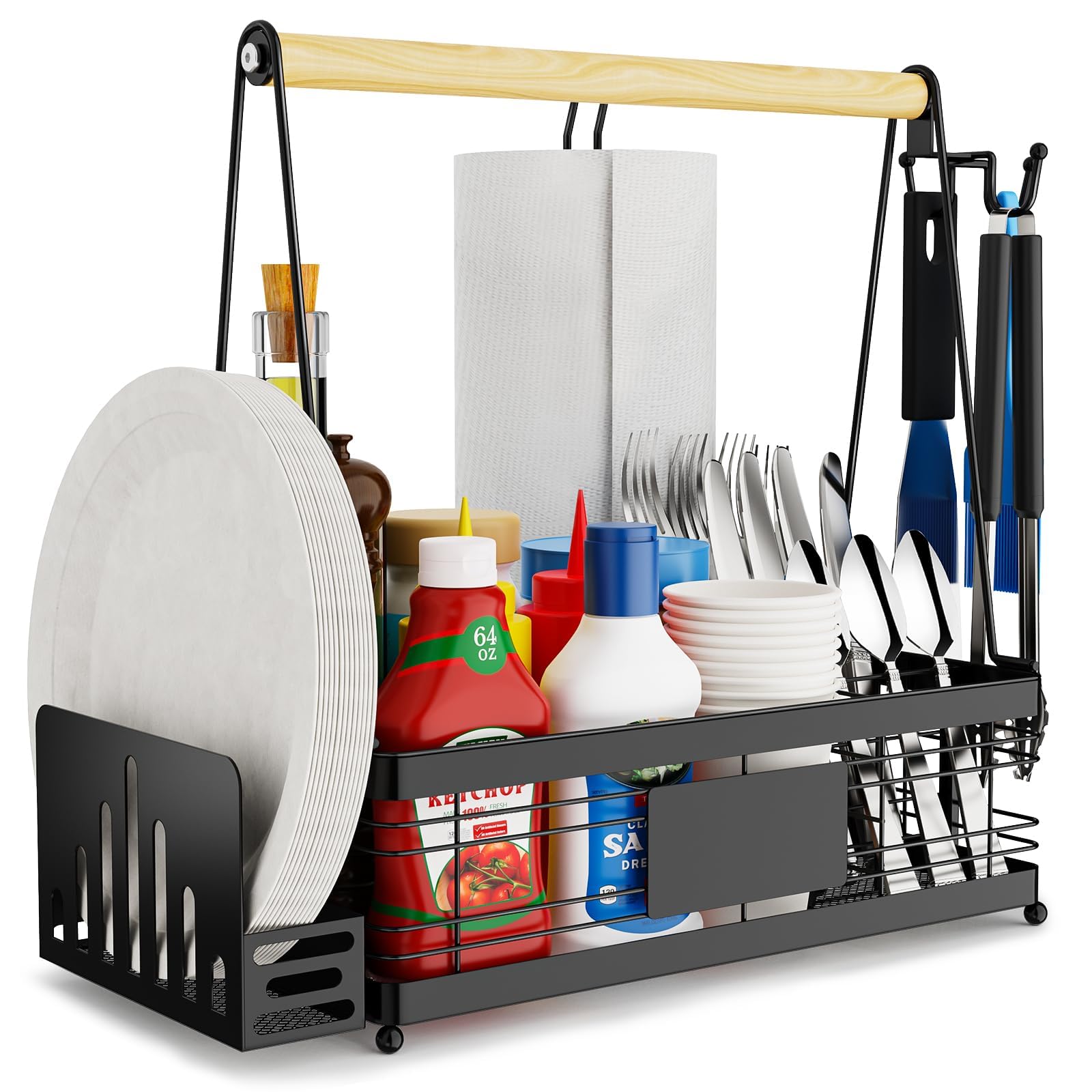 Grill Caddy with Plate Holder and Paper Towel Holder, Picnic BBQ Condiment Utensil Organizer Caddy for Outdoor Cooking, Camping Essential, Camper Must Haves, Grilling Gifts for Men Style A
