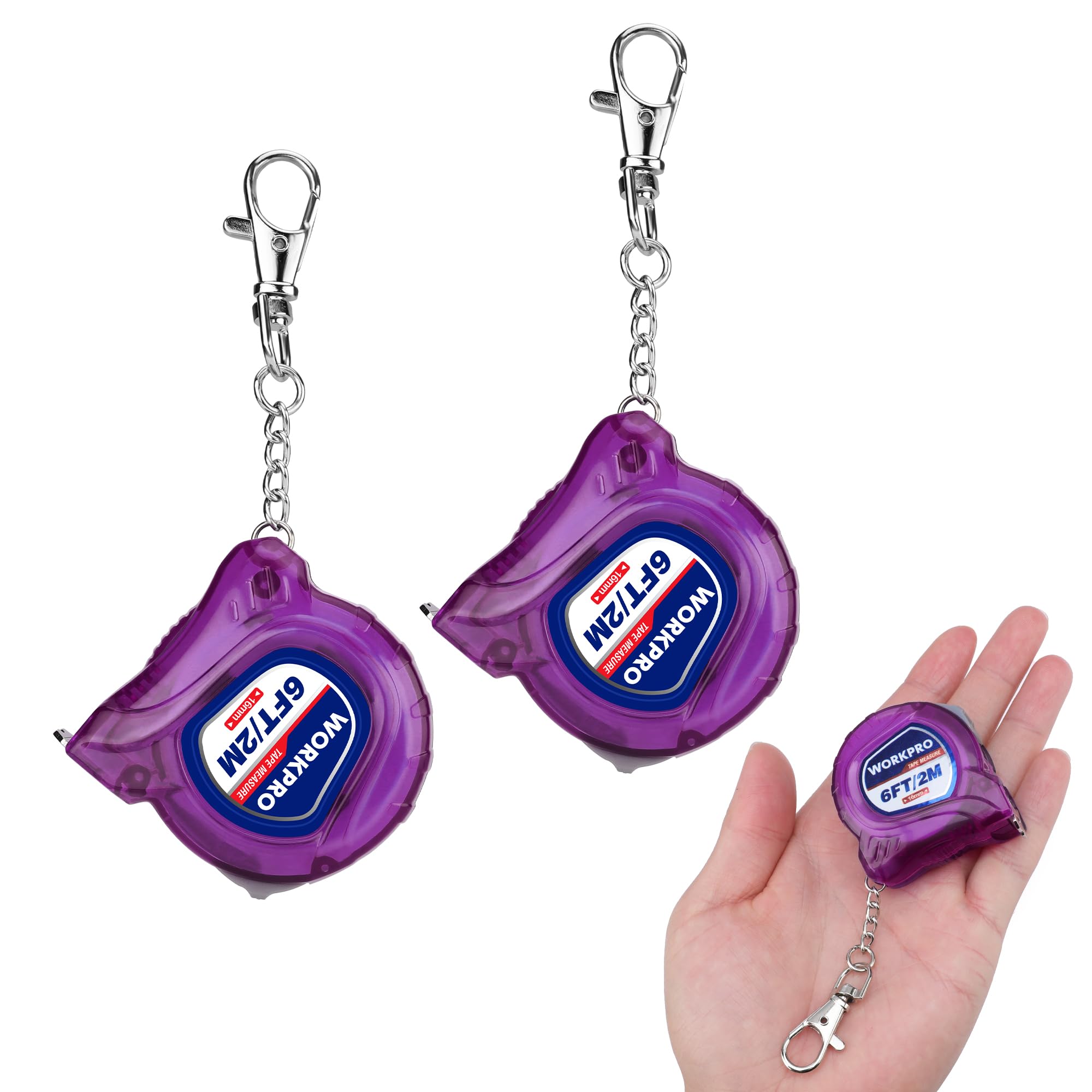 A compact, pocket-size WORKPRO tape measure you can clip to your keys—this 2-pack includes two purple 6ft retractable mini tapes with easy-to-read inch/metric scales and lightweight ABS housings.