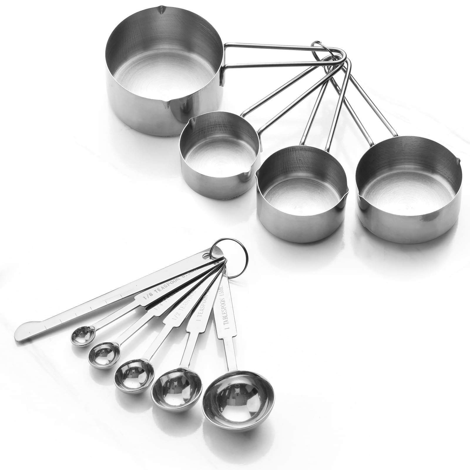 A practical 10-piece stainless steel measuring set from YILIHCIA with 4 cups, 5 spoons, and a leveling scraper—built for everyday baking and cooking with ergonomic handles, dual-pour spouts, and easy-care durability.