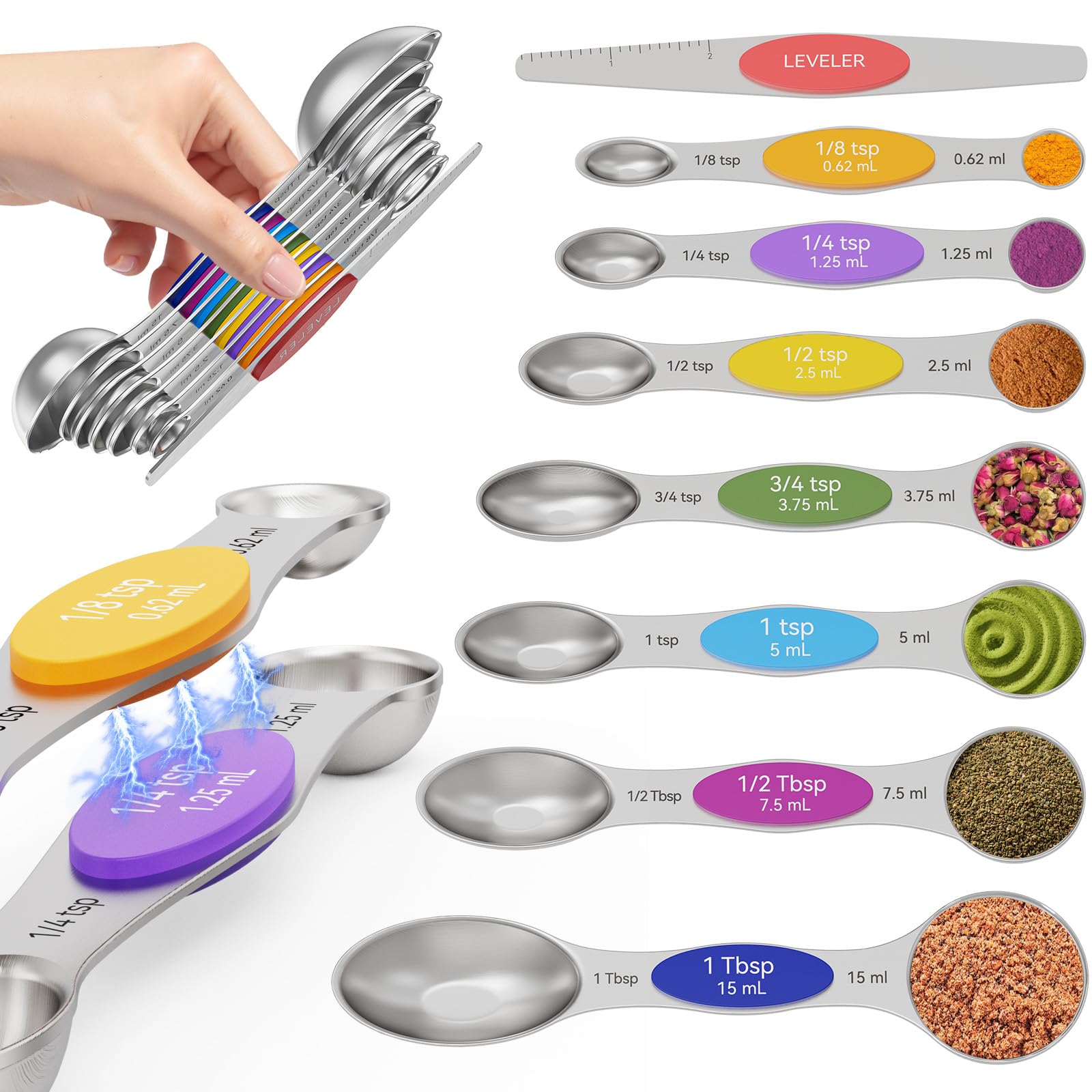 A space-saving set of colorful magnetic measuring spoons from Abtrino, made from heavy-duty 304 stainless steel with strong N52 magnets, triple measurement markings, and a leveler for consistent measuring.
