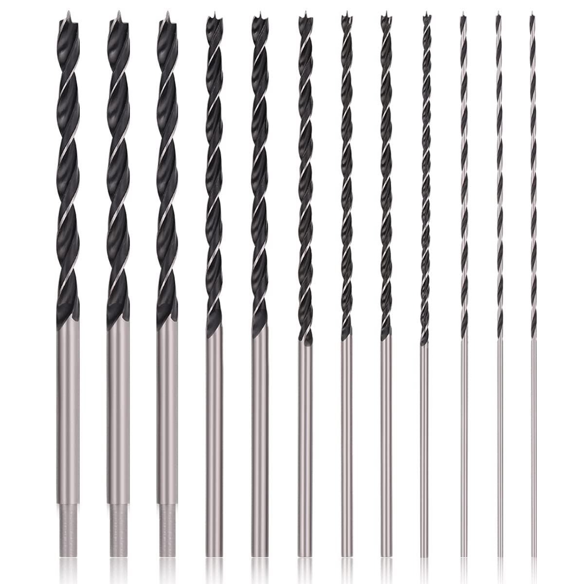 A 12-piece, 12″ extra-long brad point drill bit set from COMOWARE designed for cleaner starts and better centering in wood and similar materials, with 7 common sizes from 1/8″ up to 1/2″ and a storage holder for organization.