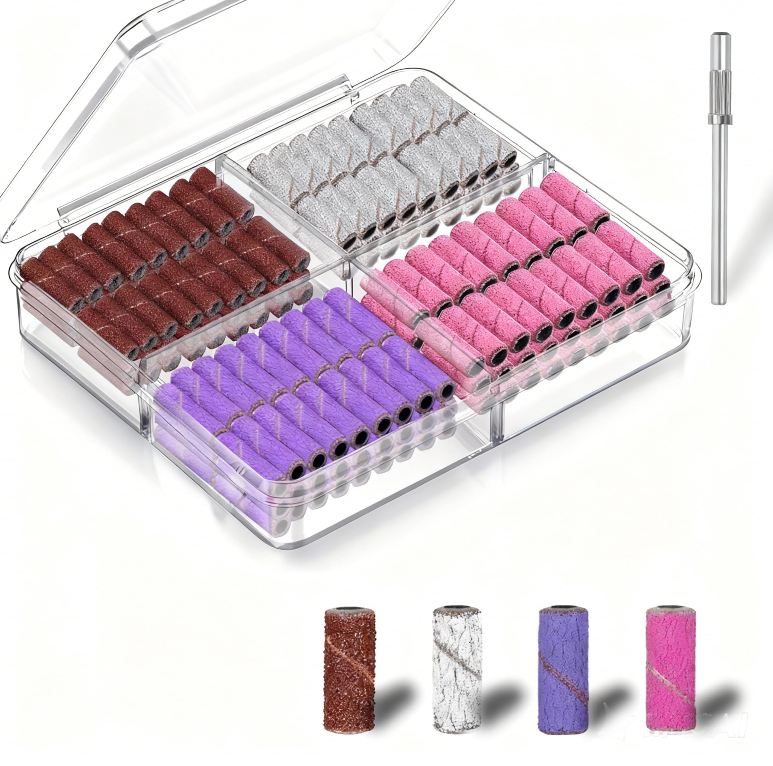 A high-quantity, color-coded sanding band set with four grits (#80, #120, #180, #240) and a 3/32″ mandrel—organized in a compact storage box for easy salon or at-home use.