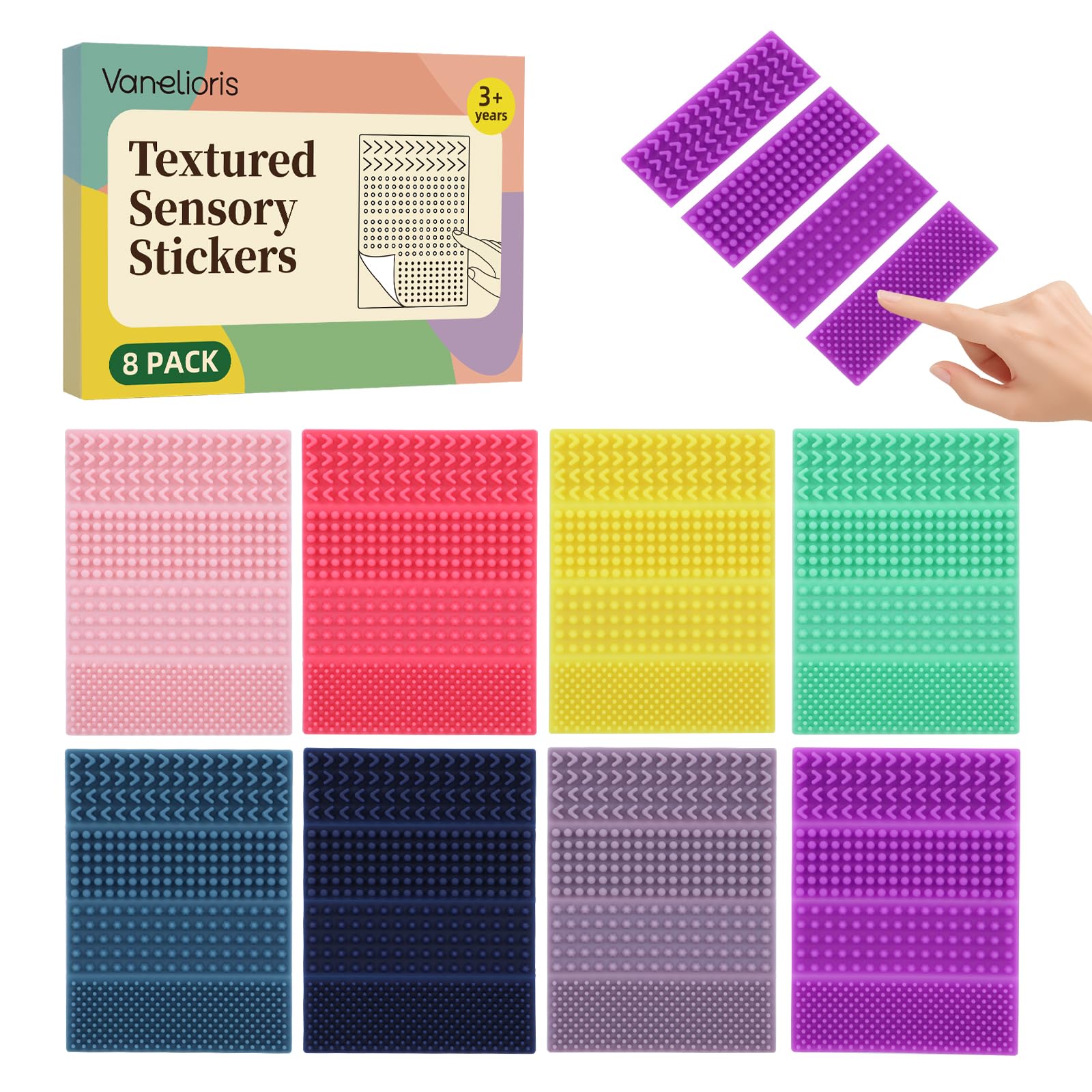 Vanelioris Sensory Stickers are quiet, textured calm strips designed for discreet fidgeting at school, work, or home. This 8-pack features layered bristle textures in calming gradient colors, with strong adhesion and an easy-to-clean silicone design.