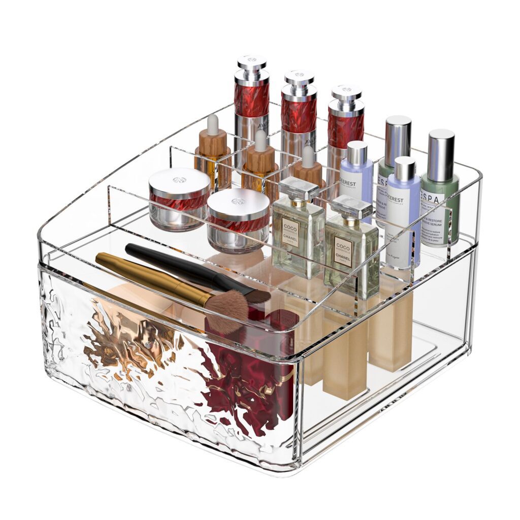 Designed with compartmentalized storage, it features multiple different-sized sections for separating everyday essentials—like larger slots for brushes and pencils and smaller areas for items such as lip products and nail polish. A dedicated pull-out drawer adds an extra spot to tuck away smaller beauty supplies.