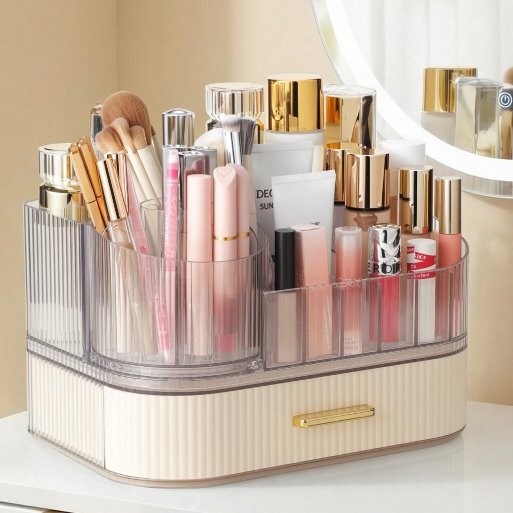 A stylish and functional makeup organizer that maximizes space and keeps essentials easily accessible.