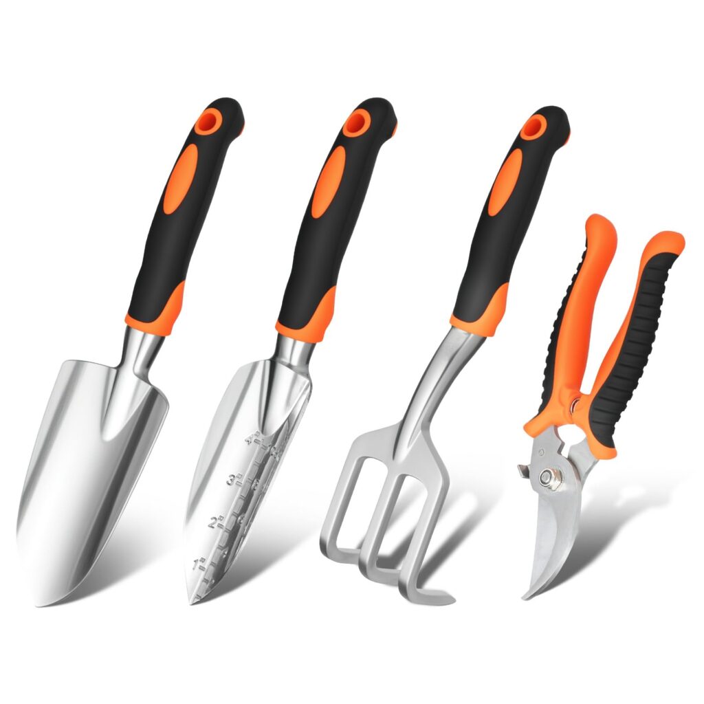 - 4-piece set includes shovel, transplant trowel, hand cultivator, and pruning shears