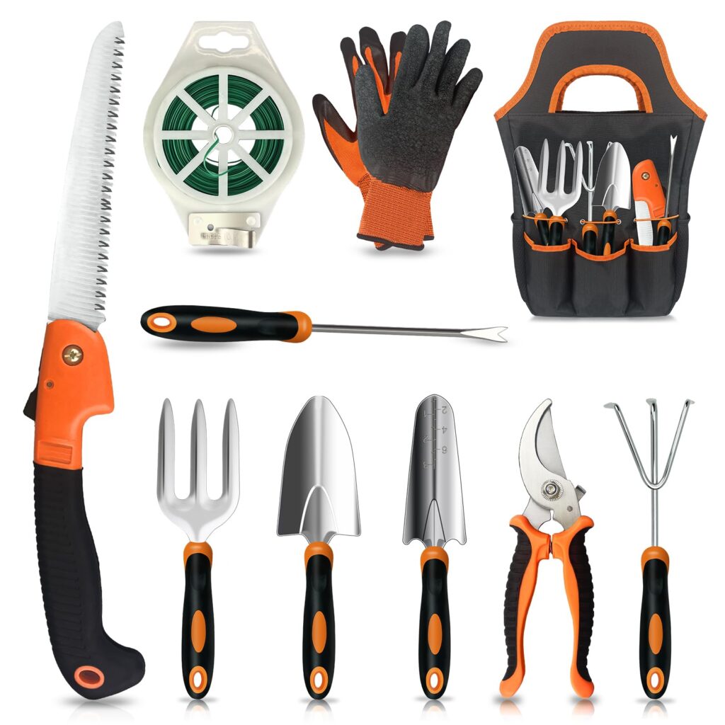 - 10-piece kit for digging, transplanting, cultivating, pruning, and trimming
