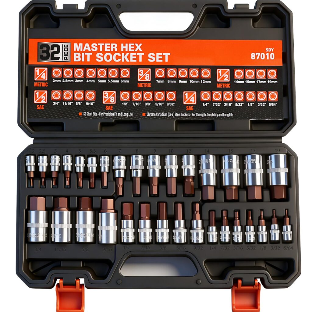 If you regularly bounce between different drive sizes and both SAE and metric Allen fasteners, the HORUSDY High Torque Master Hex Bit Socket Set is designed to simplify your workflow. This 32-piece set combines commonly used hex bit sockets in one organized case, making it a practical choice for automotive repair, machinery maintenance, and general shop tasks.