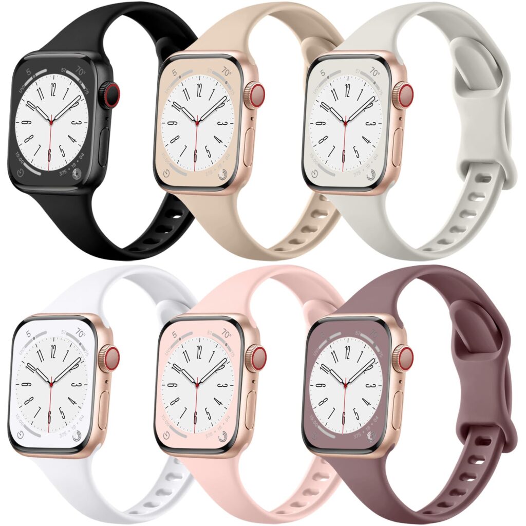 This set includes 6 versatile colors (Black, Nude, Starlight, White, Sand Pink, and Smoke Violet), so you can quickly match your Apple Watch to your outfit, season, or occasion. The narrow design is especially popular for a more refined, streamlined appearance.
