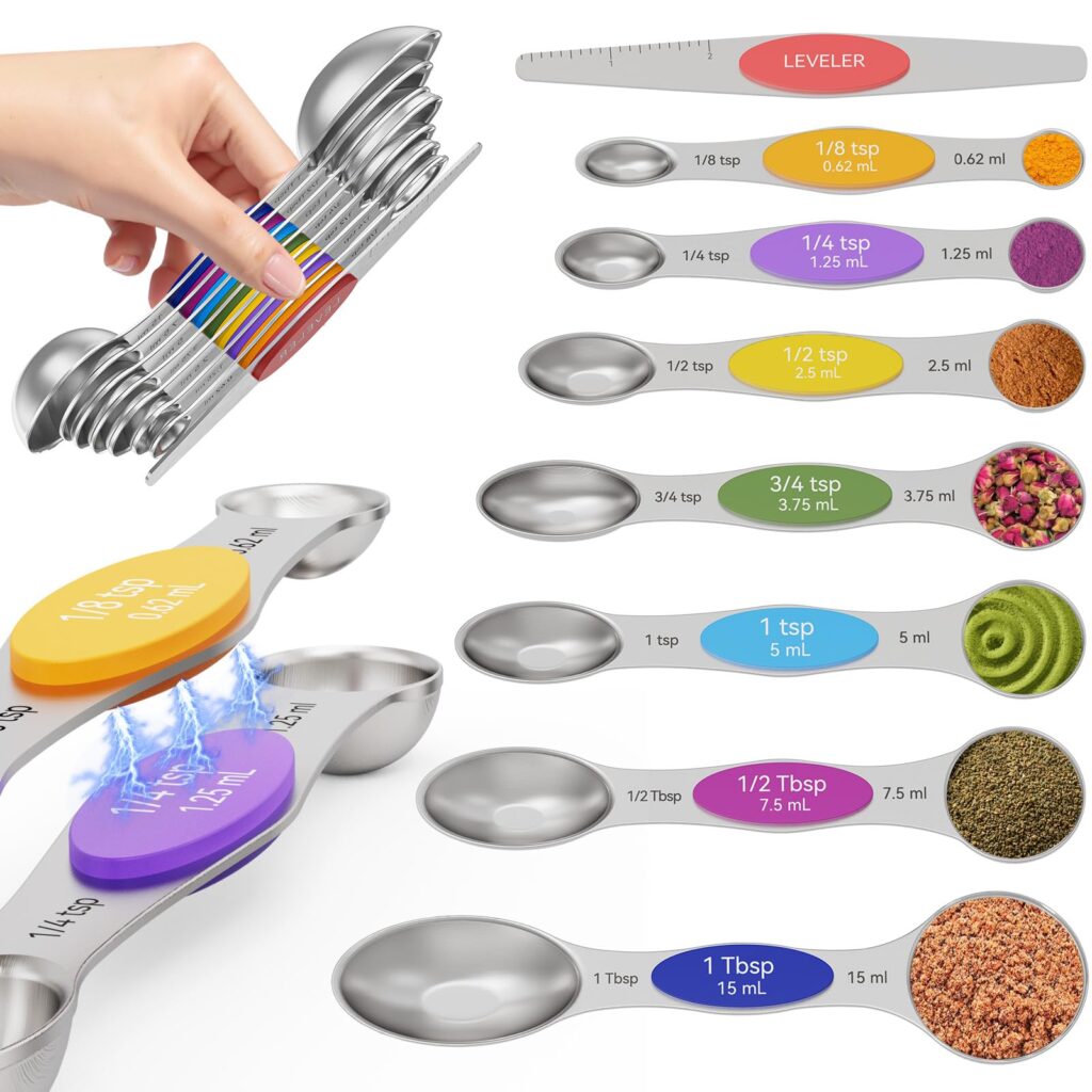 If youâre tired of measuring spoons getting separated, hard-to-read labels, or bulky storage rings, the Abtrino Magnetic Measuring Spoons Set is designed to make everyday measuring faster and more organized. Each spoon nests neatly thanks to strong N52 magnets, so you can keep the whole set together in a drawerâor stick them to a metal surface for quick access.