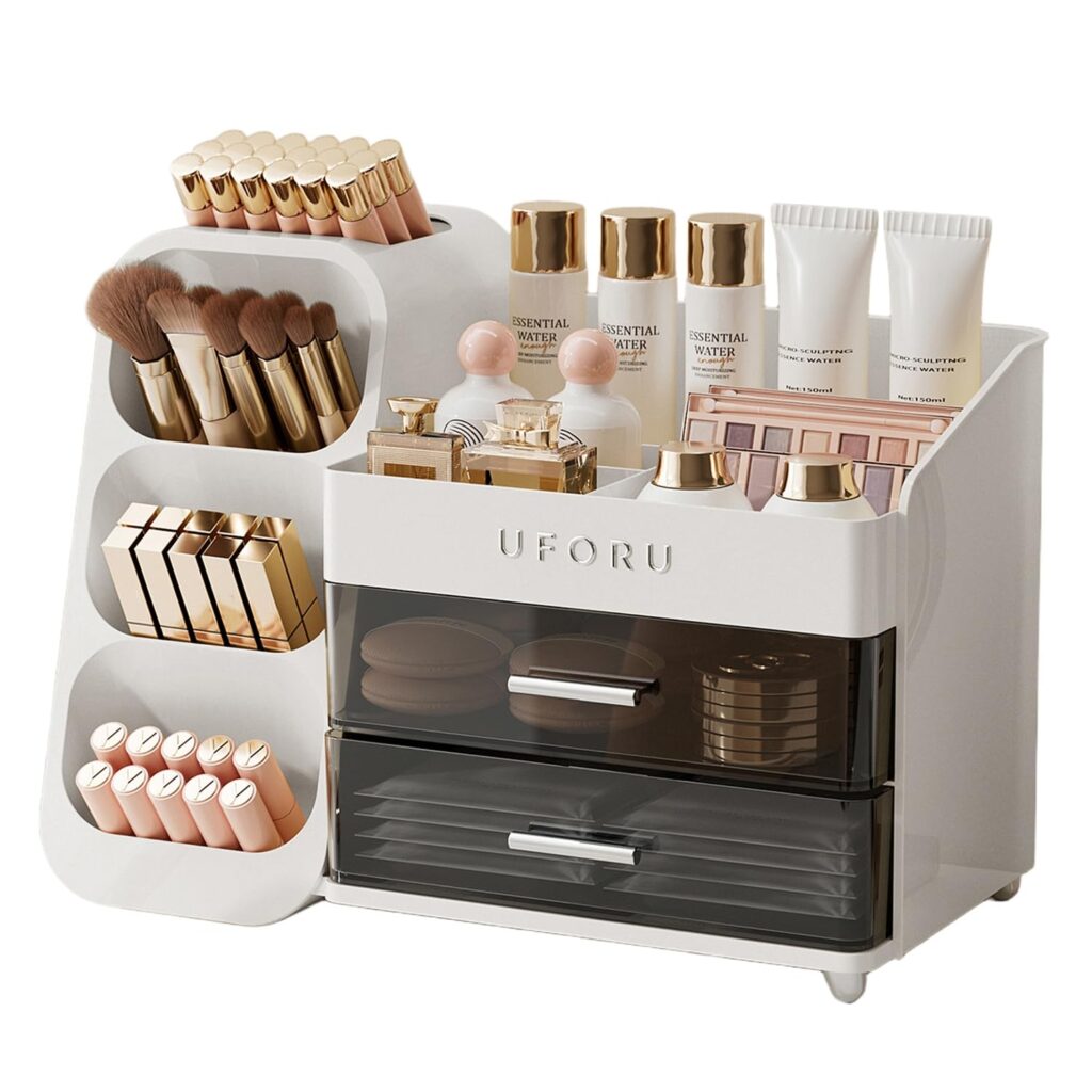 If your vanity or bathroom counter is always covered in bottles, palettes, and tools, the UFORU Makeup Organizer gives everything a dedicated home—without turning your routine into a scavenger hunt. Its compartmentalized, open-top design keeps daily essentials visible and within reach, while two drawers help tuck away smaller items for a cleaner look.