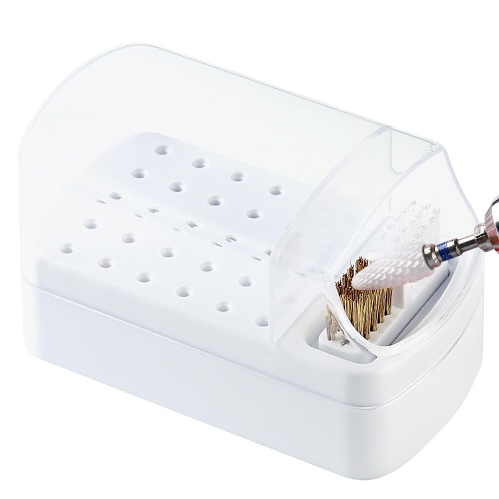 Nail Bit Holder & Nail Drill Bit Cleaner 2 in 1, 30 Holes Nail Drill Holder Organizer Nail Bit Brush Cleaner Drill Bit Holder for Nails Dustproof Stand Displayer Storage Box Tools-White
