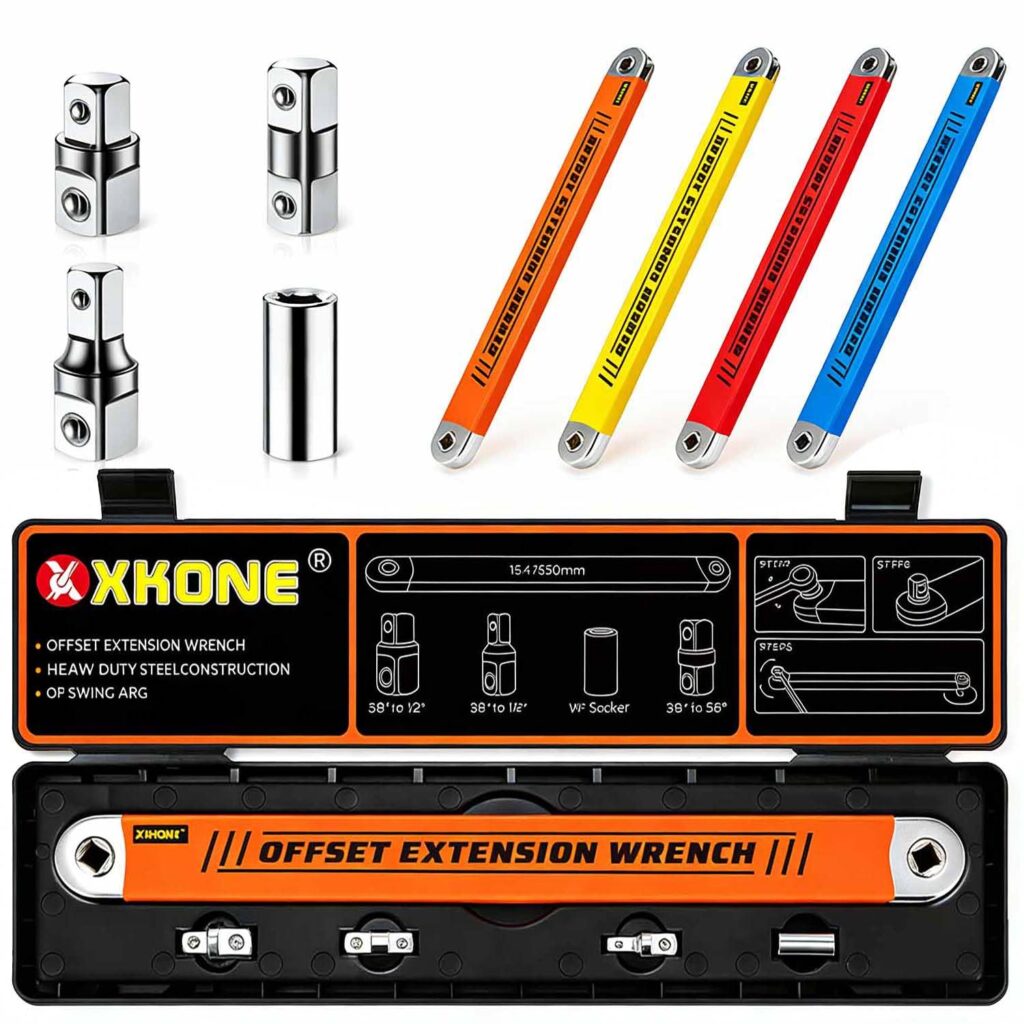 The XKONE Offset Extension Wrench is built for the frustrating jobs—fasteners tucked behind brackets, under the hood, or in cramped assembly spaces where a traditional ratchet needs swing room. Its zero-degree swing design helps you turn fasteners in tight clearances while keeping a low-profile, flat structure for easier access.
