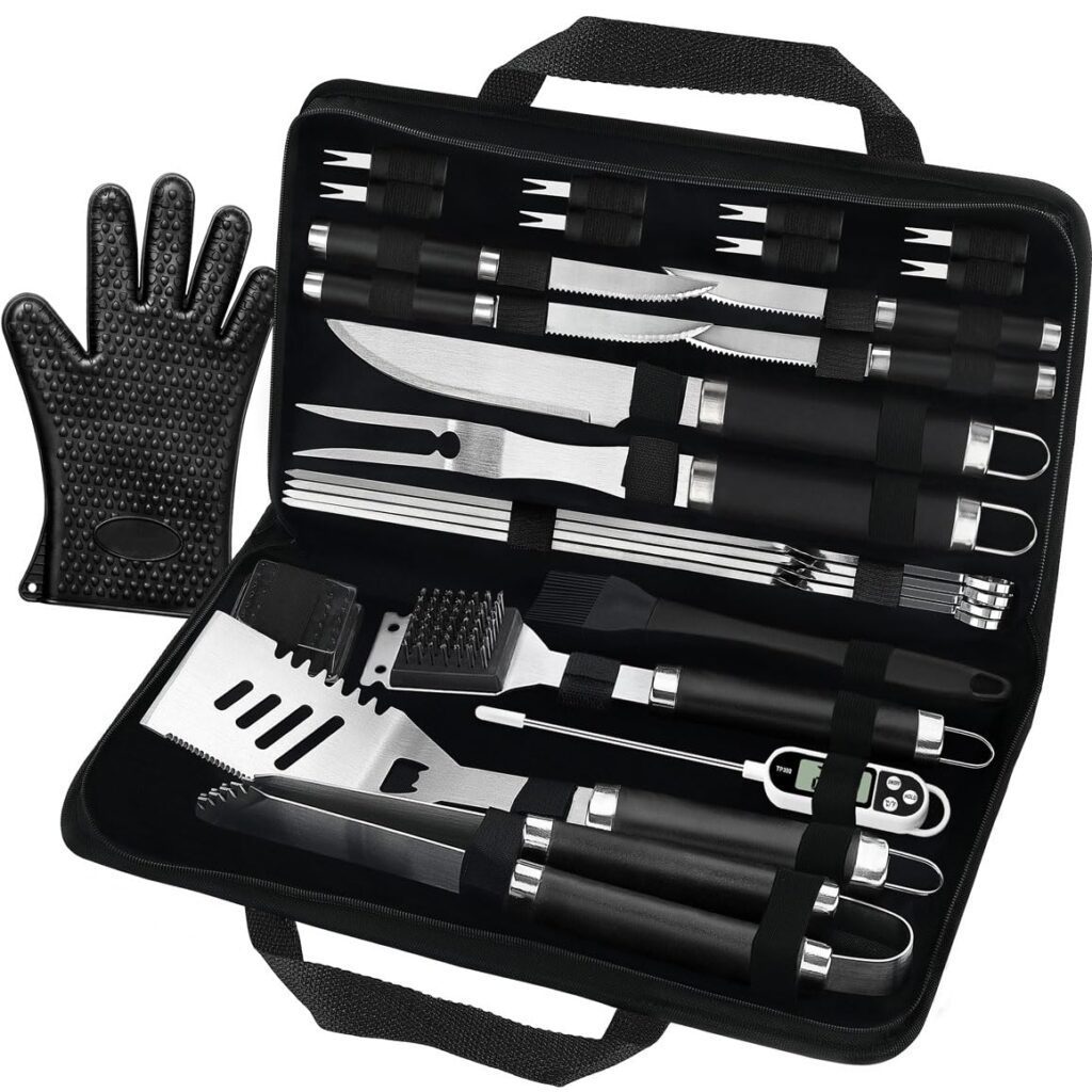 What’s included: barbecue spatula, barbeque fork, BBQ tongs, meat knife, basting brush, barbecue cleaning brush, replacement brush head, silicone glove, meat thermometer, 4 steak knives, 8 corn holders, 4 kabab skewers, and a durable zipper bag.