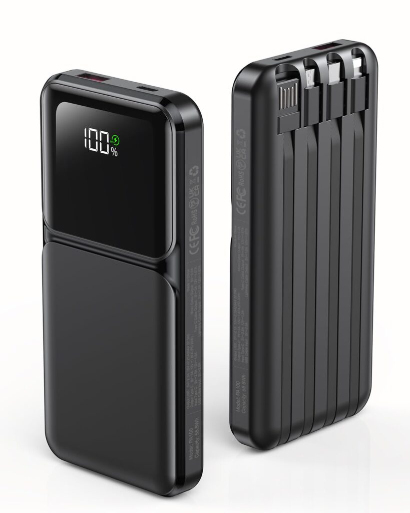 • 10000mAh portable charger with four built-in cables (iOS, USB-C, USB, Micro) for broad device compatibility