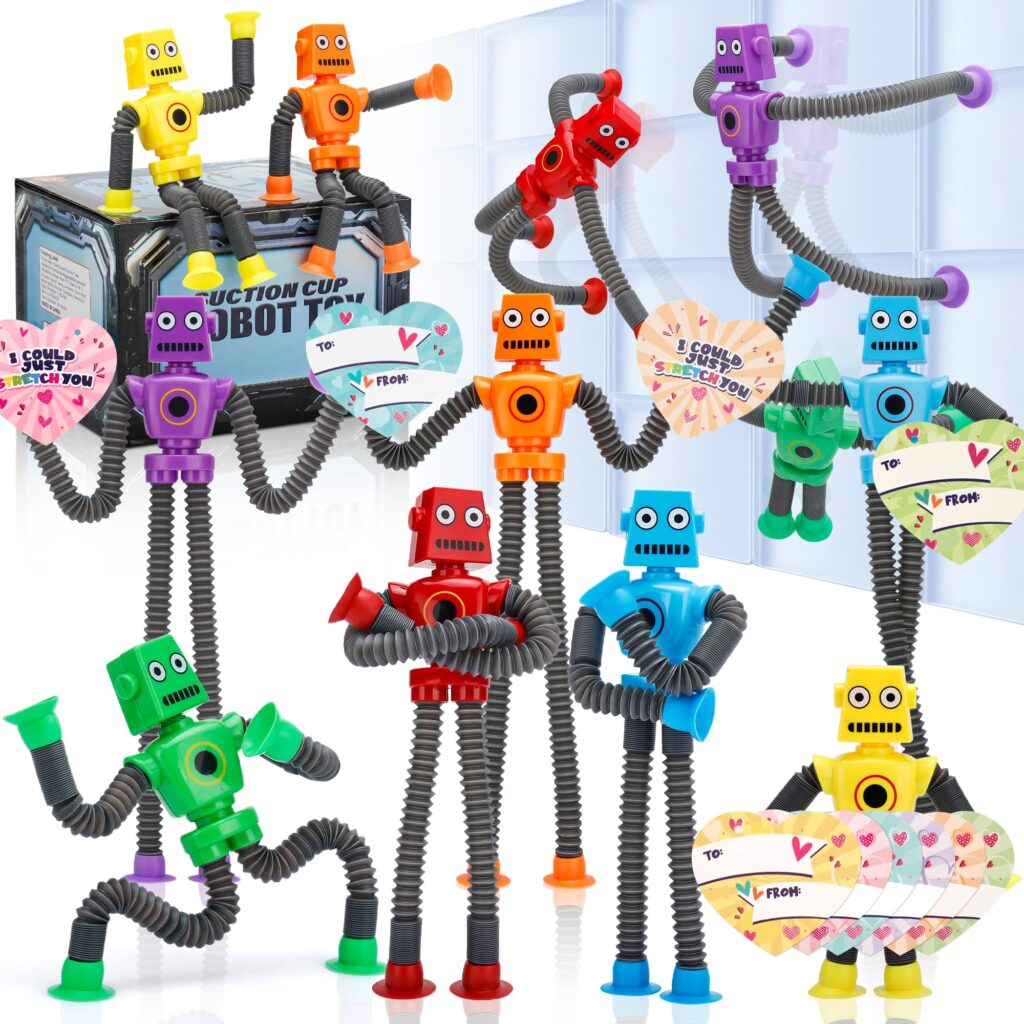 Robot Suction Cup Toys Pop Tubes | 12 PCS-Stretchy Sensory Fidget Toys for Kids Ages 3+ | Perfect for Travel, Party Favors,Autism, Stress Relief | Valentines Day Gift Exchange