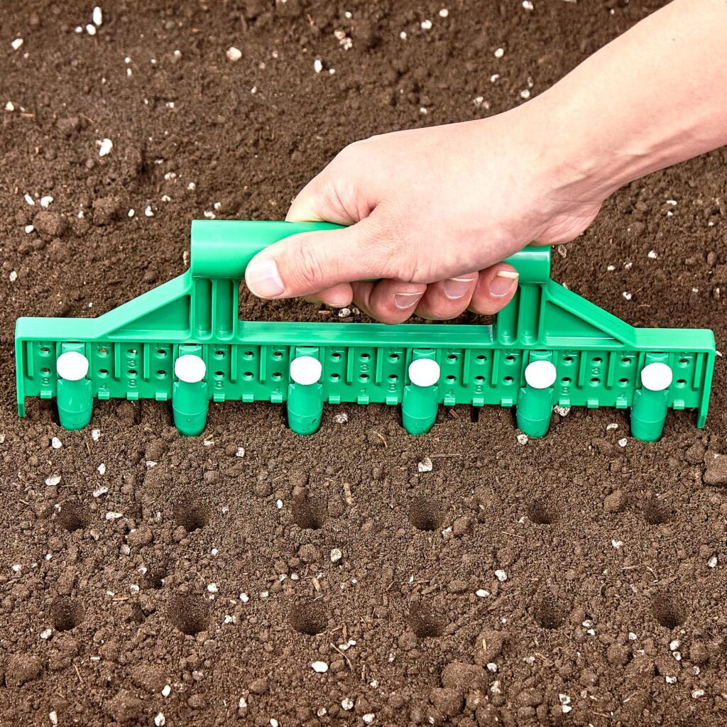 This tool features a 12-inch handle and 12 detachable pins that can be combined to match your preferred spacing. With seven spacing options (from 1 inch up to 12 inches), it’s useful for a variety of seed-starting needs, from tighter plantings to wider spacing. The handle includes two rows of holes so you can use two pin lengths to adjust planting depth for different seed types.