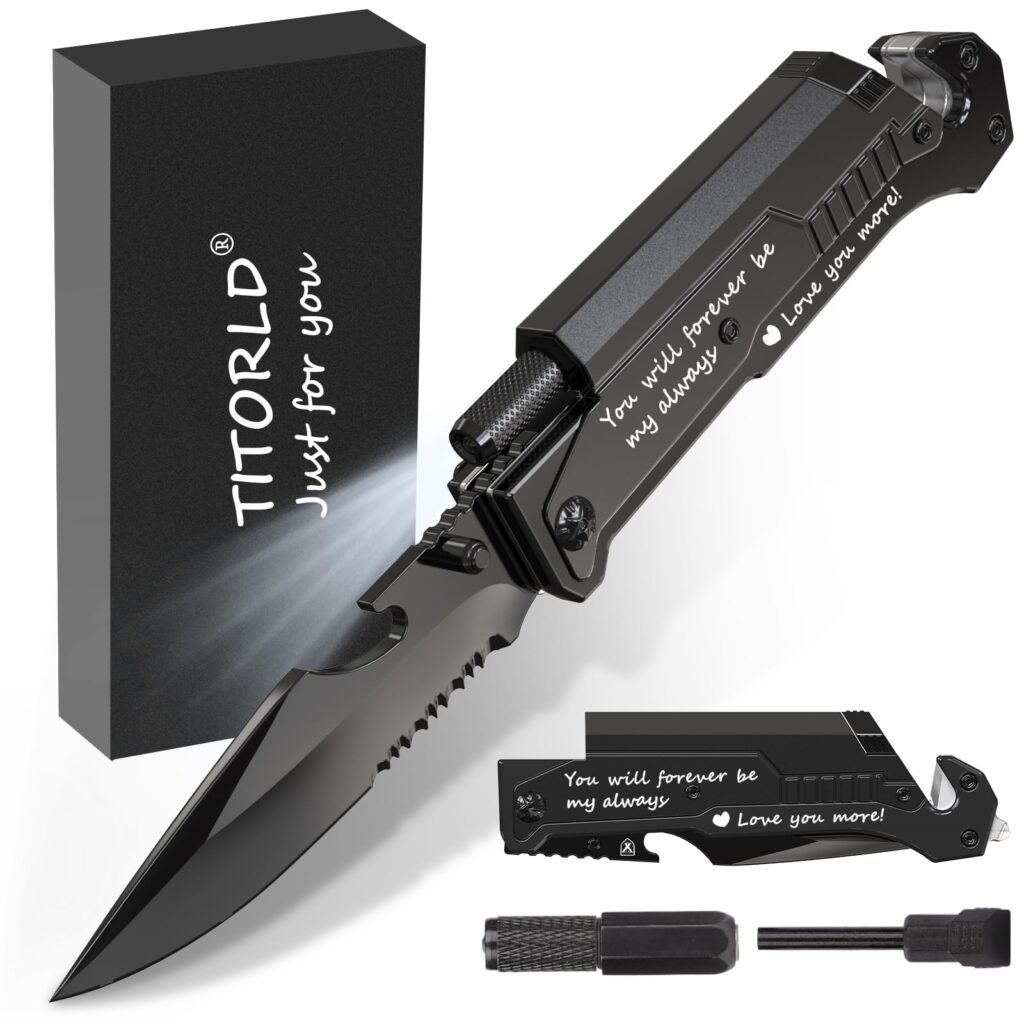 Titorld Gifts for Him Men Valentines Day, Anniversary Birthday Gifts for Him Boyfriend Husband, Engraved Pocket Knife, Camping Hunting Multitool Knife Present, 7 in 1 Folding Knives with LED Light 3-Him-Black-Gift box