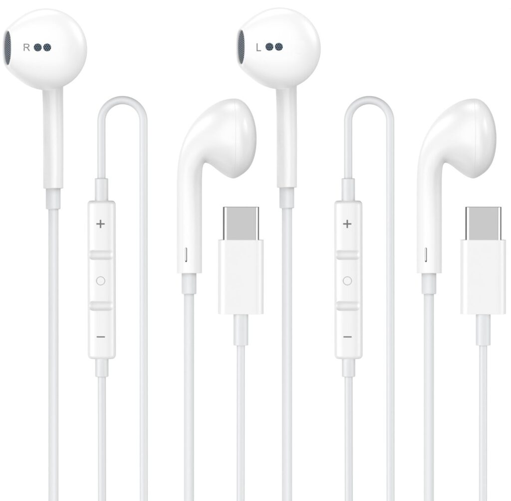 - 2-pack USB-C wired in-ear headphones (white) for everyday backup or multiple devices