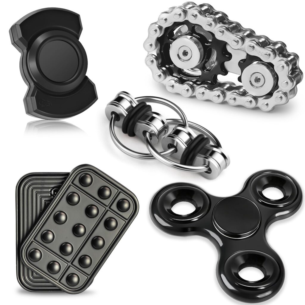 This assortment includes a magnetic fidget slider (built for smooth, stable slides), a spinner that spins quickly, and multiple chain-based fidgets that offer tactile movement. Because each piece fidgets differently, it’s easy to swap depending on your setting—at a desk, during study breaks, or while traveling.