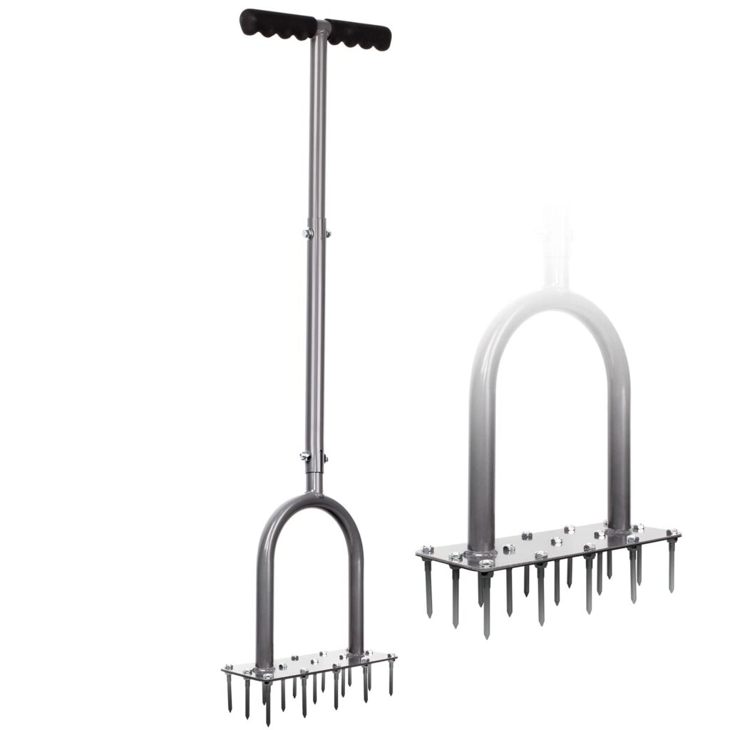 Its high-efficiency design uses 15 sharp spikes (2.8 inches long) working at the same time to help you cover more ground with fewer steps. The tool is built with durable iron construction and a powder-coated finish for heavy-duty, rust-resistant performance. A 34.6-inch length is designed to help reduce back strain, while the cushion-designed T-handle and foot bar leverage aim to make each press easier and more energy-saving.