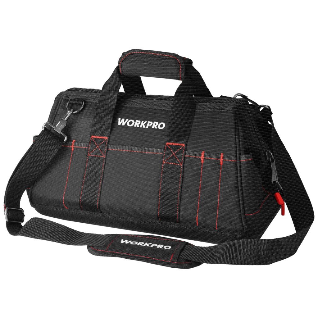 The WORKPRO 16-inch Close Top Wide Mouth Tool Storage Bag (W081022A) is built for everyday carry and quick tool access. With a wide-open mouth supported by an internal metal frame, you can see what you need and grab it fast—without digging through a collapsed bag.